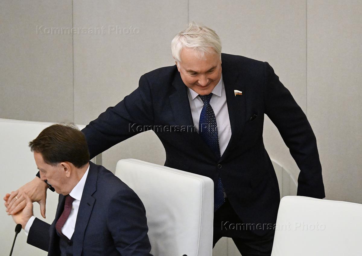 Пленарное заседание Государственной думы (ГД) России. Председатель комитета ГД России по обороне Андрей Картаполов (справа) и заместитель председателя ГД России Алексей Гордеев (слева) во время заседания.