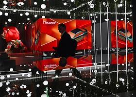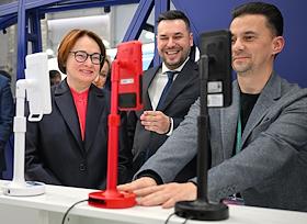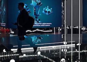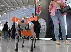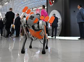 Форум инновационных финансовых технологий Finopolis в университете "Сириус". Жанровая фотография. Модель собаки-робота на форуме.