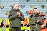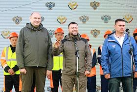 Церемония открытия участка автомобильной дороги Р-280 "Новороссия" после капитального ремонта. Глава Донецкой Народной Республики Денис Пушилин (в центре) и председатель правительства Донецкой Народной Республики Евгений Солнцев (слева) во время церемонии.