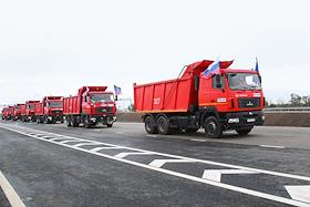 Церемония открытия участка автомобильной дороги Р-280 "Новороссия" после капитального ремонта. Жанровая фотография. Колонна грузовых автомобилей "МАЗ" во время церемонии.