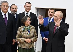 Рабочая поездка президента России Владимира Путина в Приволжский федеральный округ. Форум "Россия - спортивная держава". Слева направо: полномочный представитель президента в Приволжском федеральном округе Игорь Комаров, глава Республики Башкортостан Радий Хабиров, министр спорта России Михаил Дегтярев, директор Спортивной школы олимпийского резерва по фехтованию Уфы Лира Грушина, помощник президента России Алексей Дюмин и президент России Владимир Путин во время посещения Центра спортивной подготовки по фехтованию Республики Башкортостан.