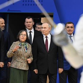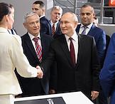 Рабочая поездка президента России Владимира Путина в Приволжский федеральный округ. Форум "Россия - спортивная держава". Слева направо: полномочный представитель президента в Приволжском федеральном округе Игорь Комаров, директор Спортивной школы олимпийского резерва по фехтованию Уфы Лира Грушина, министр спорта России Михаил Дегтярев, президент России Владимир Путин и помощник президента России Алексей Дюмин во время посещения Центра спортивной подготовки по фехтованию Республики Башкортостан.