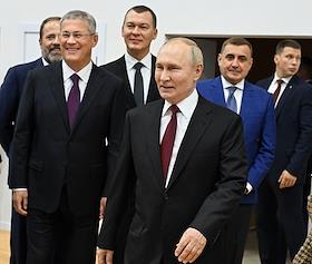 Рабочая поездка президента России Владимира Путина в Приволжский федеральный округ. Форум "Россия - спортивная держава". Слева направо: глава Республики Башкортостан Радий Хабиров, министр спорта России Михаил Дегтярев, президент России Владимир Путин и помощник президента России Алексей Дюмин во время посещения Центра спортивной подготовки по фехтованию Республики Башкортостан.