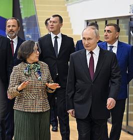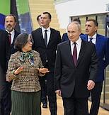 Рабочая поездка президента России Владимира Путина в Приволжский федеральный округ. Форум "Россия - спортивная держава". Президент России Владимир Путин (в центре, слева) и директор Спортивной школы олимпийского резерва по фехтованию Уфы Лира Грушина (в центре, справа) во время посещения Центра спортивной подготовки по фехтованию Республики Башкортостан.