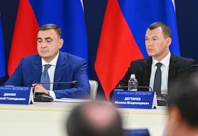 Рабочая поездка президента России Владимира Путина в Приволжский федеральный округ. Форум "Россия - спортивная держава". Министр спорта России Михаил Дегтярев (справа) и помощник президента России Алексей Дюмин (слева) во время заседания Совета при президенте России по развитию физической культуры и спорта по вопросу "О роли негосударственных организаций в развитии физической культуры и спорта".