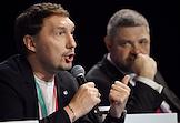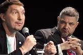 Форум инновационных финансовых технологий Finopolis в университете "Сириус". Пленарная дискуссия: "Прорубят ли ЦФА окно в Web 3.0?". Генеральный директор процессинговой компании Uniteller Алексей Богаткин (слева) и заместитель председателя Центрального Банка России Филипп Габуния (справа) во время дискуссии.