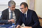 Собрание Союза российских городов на тему "Проблемы и перспективы городского развития" в Общественной палате России. Начальник Департамента по работе с органами местного самоуправления Управления президента России по внутренней политике Михаил Котлов (слева) и генеральный директор Союза российских городов Андрей Максимов (справа) во время собрания.