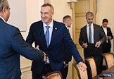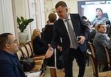 Собрание Союза российских городов на тему "Проблемы и перспективы городского развития" в Общественной палате России. Председатель Союза российских городов, губернатор Ханты-Мансийского автономного округа - Югры Руслан Кухарук перед началом собрания.