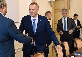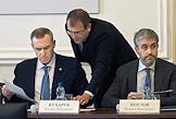 Собрание Союза российских городов на тему "Проблемы и перспективы городского развития" в Общественной палате России. Председатель Союза российских городов, губернатор Ханты-Мансийского автономного округа - Югры Руслан Кухарук, генеральный директор Союза российских городов Андрей Максимов и начальник Департамента по работе с органами местного самоуправления Управления президента России по внутренней политике Михаил Котлов перед началом собрания.