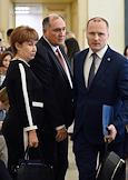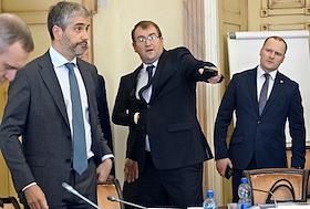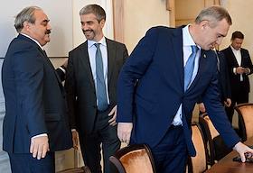 Собрание Союза российских городов на тему "Проблемы и перспективы городского развития" в Общественной палате России. Слева направо: мэр города Великий Новгород Александр Розбаум, генеральный директор Союза российских городов Андрей Макаров и председатель Союза российских городов, губернатор Ханты-Мансийского автономного округа - Югры Руслан Кухарук перед началом собрания.