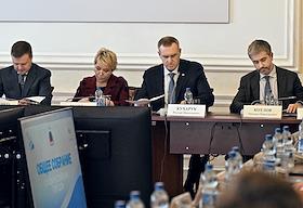 Собрание Союза российских городов на тему "Проблемы и перспективы городского развития" в Общественной палате России. Слева направо: председатель комитета Государственной думы России по региональной политике и местному самоуправлению Алексей Диденко, сопредседатель Всероссийской ассоциации развития местного самоуправления (ВАРМСУ) Ирина Гусева, председатель Союза российских городов, губернатор Ханты-Мансийского автономного округа - Югры Руслан Кухарук и начальник Департамента по работе с органами местного самоуправления Управления президента России по внутренней политике Михаил Котлов во время собрания.