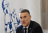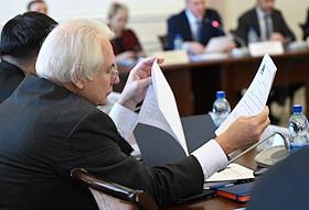 Собрание Союза российских городов на тему "Проблемы и перспективы городского развития" в Общественной палате России. Мэр города Великий Новгород Александр Розбаум во время собрания.