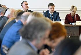 Собрание Союза российских городов на тему "Проблемы и перспективы городского развития" в Общественной палате России. Слева направо: член комитета Государственной думы (ГД) России по развитию Дальнего Востока и Арктики Алексей Веллер, мэр города Великий Новгород Александр Розбаум, председатель комитета ГД России по региональной политике и местному самоуправлению Алексей Диденко во время собрания.