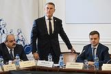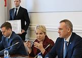 Собрание Союза российских городов на тему "Проблемы и перспективы городского развития" в Общественной палате России. Слева направо: мэр города Великий Новгород Александр Розбаум, председатель комитета Государственной думы России по региональной политике и местному самоуправлению Алексей Диденко и сопредседатель Всероссийской ассоциации развития местного самоуправления (ВАРМСУ) Ирина Гусева во время собрания.