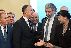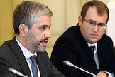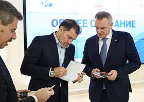 Собрание Союза российских городов на тему "Проблемы и перспективы городского развития" в Общественной палате России. Председатель Союза российских городов, губернатор Ханты-Мансийского автономного округа - Югры Руслан Кухарук (слева) после собрания.