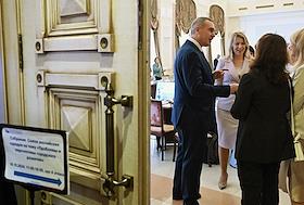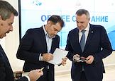 Собрание Союза российских городов на тему "Проблемы и перспективы городского развития" в Общественной палате России. Глава муниципального образования город Краснодар Евгений Наумов (в центре) перед началом собрания.