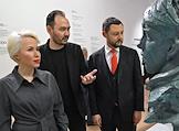 Пресс-показ выставки "Вещи и видения". Новая экспозиция коллекции Московского музея современного искусства (MMOMA), приуроченная 25-летию музея, в MMOMA на Петровке. Слева направо: куратор выставки Андрей Егоров, заместитель министра культуры России Надежда Преподобная и исполнительный директор ММОМА Василий Церетели во время пресс-показа.