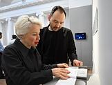 Пресс-показ выставки "Вещи и видения". Новая экспозиция коллекции Московского музея современного искусства (MMOMA), приуроченная 25-летию музея, в MMOMA на Петровке. Заместитель министра культуры России Надежда Преподобная (слева) и куратор выставки Андрей Егоров (справа) во время пресс-показа.