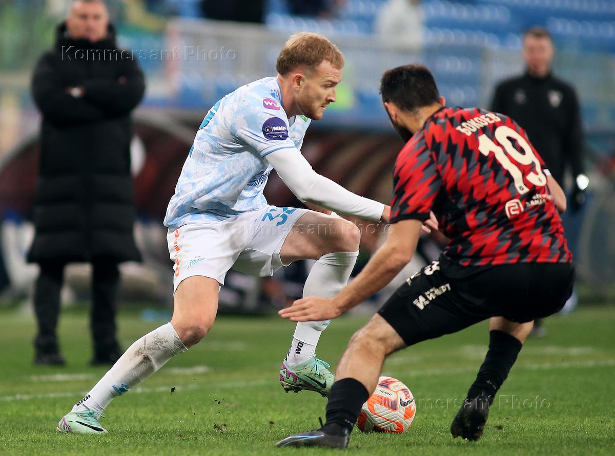 Мир Российская Премьер-Лига (РПЛ) 2024/2025. 12-й тур. Матч между командами "Акрон" (Тольятти) - "Зенит" (Санкт-Петербург) на стадионе "Солидарность Арена". Игрок команды "Акрон" Беншимол (справа) во время матча.