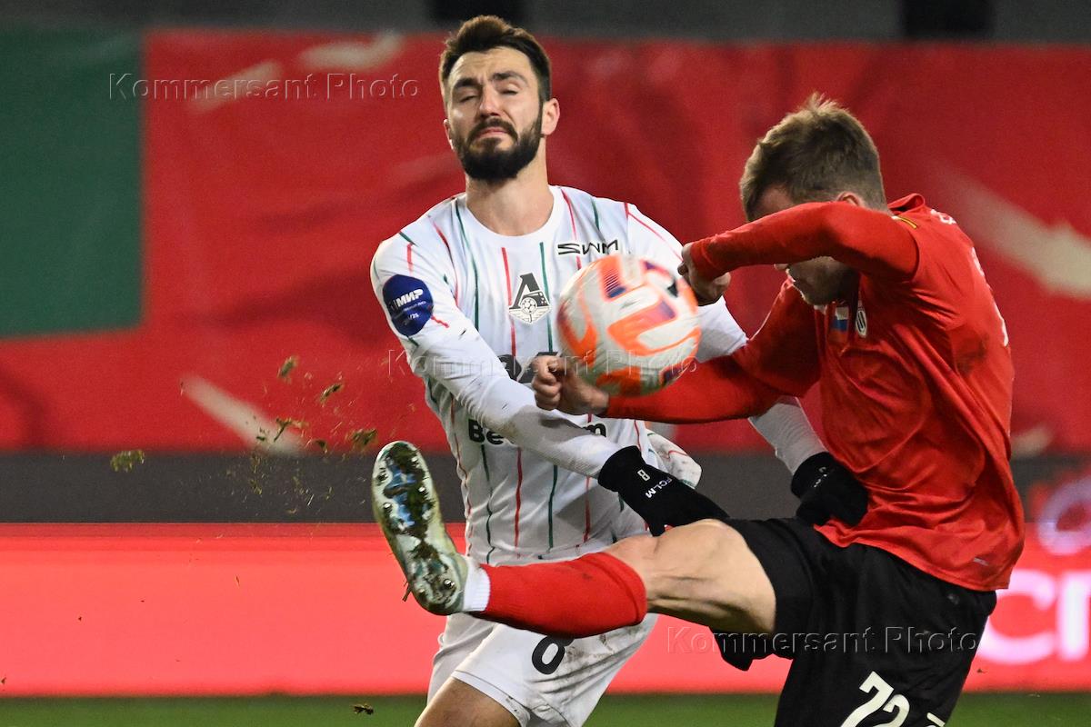 Мир Российская Премьер-Лига (РПЛ) 2024/2025. 12-й тур. Матч между командами "Химки" (Химки) - "Локомотив" (Москва) на стадионе "Арена Химки". Игрок команды "Локомотив" Егор Погостов (справа) и игрок команды "Химки" Антон Заболотный (слева) во время матча.