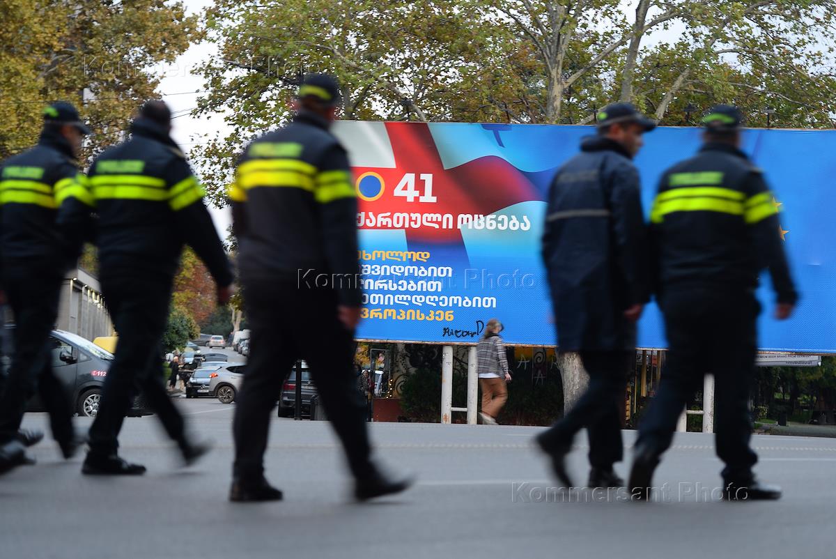 Акция "Грузия выбирает ЕС" в Тбилиси. Жанровая фотография. Сотрудники полиции на фоне баннера партии "Грузинская мечта".