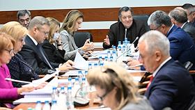 Заседание комитета Государственной Думы (ГД) России по бюджету и налогам. Председатель комитета ГД России по бюджету и налогам Андрей Макаров (в центре) и первый заместитель председателя комитета ГД России по бюджету и налогам Глеб Хор (второй справа) во время заседания.