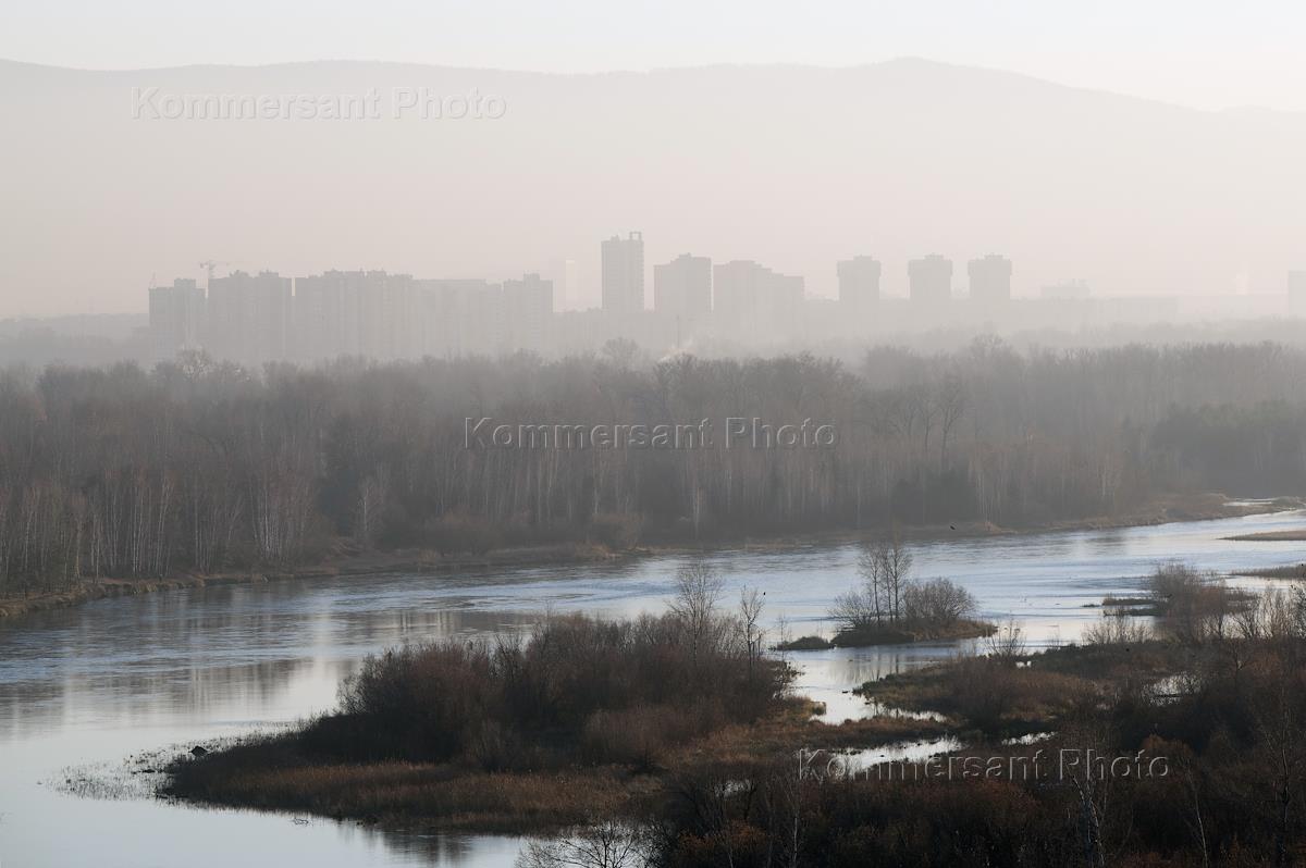 Жанровая фотография. Режим черного неба. Вид на реку Енисей, остров Татышева и район Южный берег.