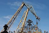 Работы по модернизации причала "Летний сад" на реке Неве. Жанровая фотография. Плавучий кран и фрагмент решетки входных ворот Летнего сада.