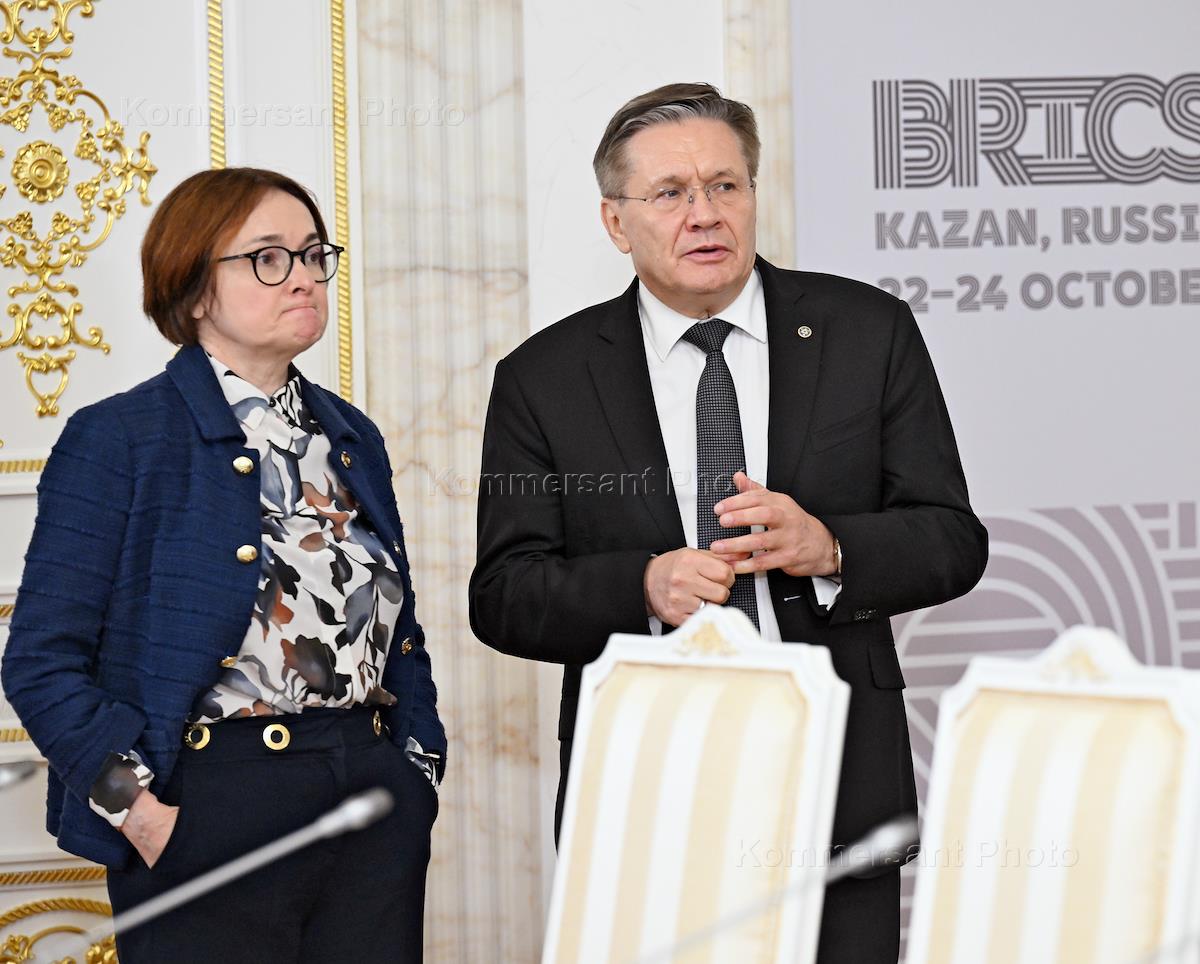 XVI Саммит БРИКС. Встреча президента России Владимира Путина и президента Нового банка развития Дилмы Роуссефф в рамках саммита. Заместитель руководителя администрации президента России Максим Орешкин (слева) и председатель Центрального Банка России Эльвира Набиуллина (справа) перед началом встречи.