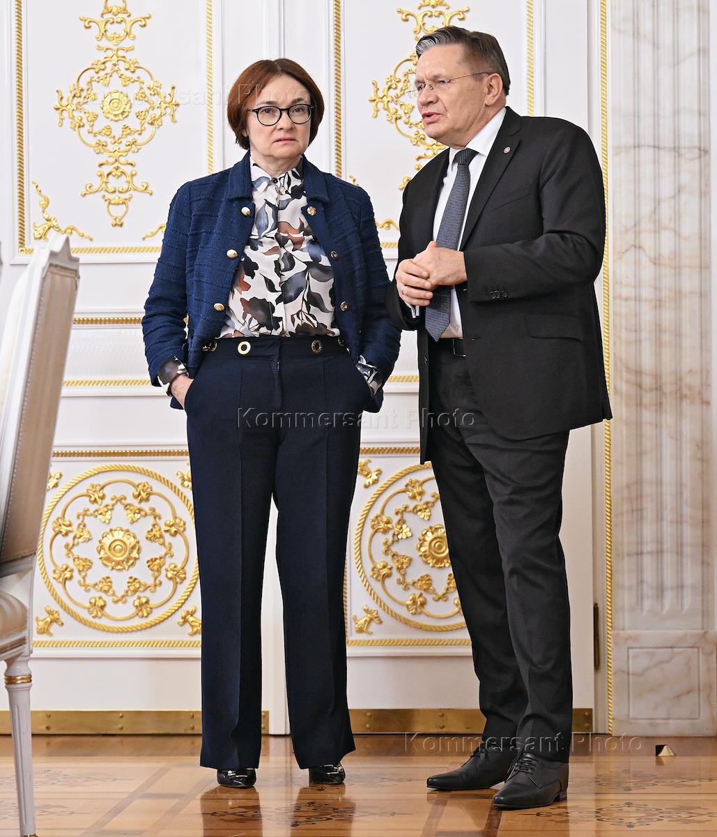 XVI Саммит БРИКС. Встреча президента России Владимира Путина и президента Нового банка развития Дилмы Роуссефф в рамках саммита. Заместитель руководителя администрации президента России Максим Орешкин (слева) и председатель Центрального Банка России Эльвира Набиуллина (справа) перед началом встречи.