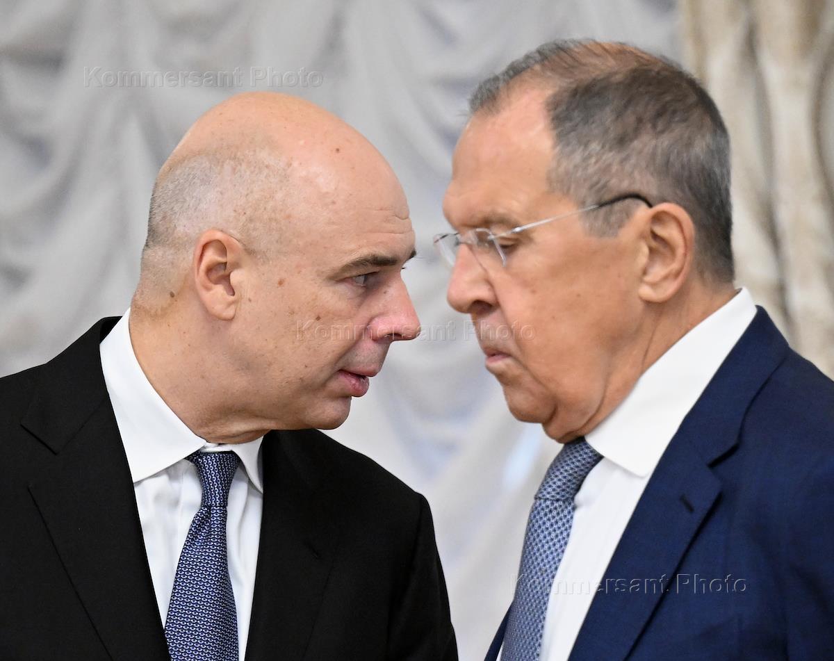 XVI Саммит БРИКС. Встреча президента России Владимира Путина и президента Нового банка развития Дилмы Роуссефф в рамках саммита. Министр финансов России Антон Силуанов (слева) и министр иностранных дел России Сергей Лавров (справа) перед началом встречи.
