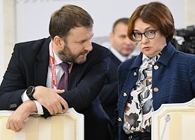 XVI Саммит БРИКС. Встреча президента России Владимира Путина и президента Нового банка развития Дилмы Роуссефф в рамках саммита. Заместитель руководителя администрации президента России Максим Орешкин (слева) и председатель Центрального Банка России Эльвира Набиуллина (справа) перед началом встречи.
