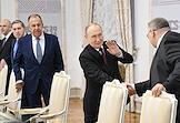XVI Саммит БРИКС. Встреча президента России Владимира Путина и президента Нового банка развития Дилмы Роуссефф в рамках саммита. Президент России Владимир Путин (справа) и министр иностранных дел России Сергей Лавров (второй справа) перед началом встречи.
