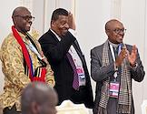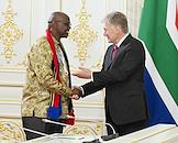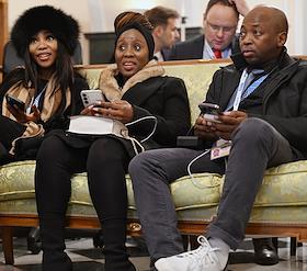 XVI Саммит БРИКС. Встреча президента России Владимира Путина с президентом ЮАР Сирилом Рамафосой в рамках форума. Слева направо: специальный советник и пресс-секретарь президента ЮАР Винсент Нтокозиси Магвенья, специальный советник министра международных отношений и сотрудничества ЮАР Кристофер Ландсберг и министр торговли, промышленности и конкуренции ЮАР Мфо Франклин Паркс Тау перед началом встречи.