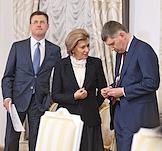 XVI Саммит БРИКС. Встреча президента России Владимира Путина с президентом ЮАР Сирилом Рамафосой в рамках форума. Справа налево: министр экономического развития России Максим Решетников, руководитель Федеральной службы по надзору в сфере защиты прав потребителей и благополучия человека - главный государственный санитарный врач России Анна Попова и заместитель председателя правительства России Александр Новак перед началом встречи.