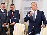 XVI Саммит БРИКС. Встреча президента России Владимира Путина с президентом ЮАР Сирилом Рамафосой в рамках форума. Справа налево: министр иностранных дел России Сергей Лавров, министр экономического развития России Максим Решетников и заместитель председателя правительства России Александр Новак перед началом встречи.