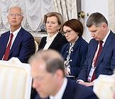 XVI Саммит БРИКС. Встреча президента России Владимира Путина и президента Нового банка развития Дилмы Роуссефф в рамках саммита. Председатель Центрального Банка России Эльвира Набиуллина (справа) и заместитель руководителя администрации президента России Максим Орешкин (в центре) во время встречи.