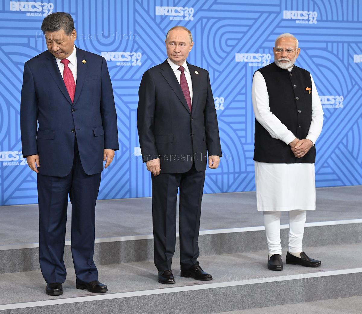 XVI BRICS Summit at the Kazan Expo IEC. Second day. From left to right: Chinese President Xi Jinping, Russian President Vladimir Putin and Indian Prime Minister Narendra Modi during the joint photographing ceremony.