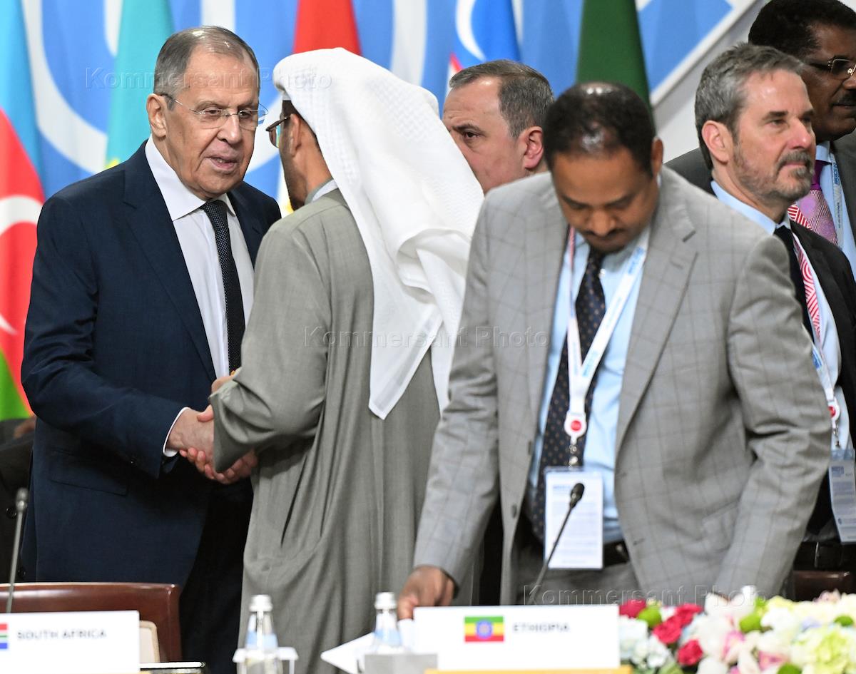 XVI BRICS Summit at the Kazan Expo IEC. Plenary session in the "outreach"/"BRICS plus" format. Russian Foreign Minister Sergei Lavrov (left) before the start of the meeting.