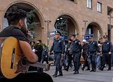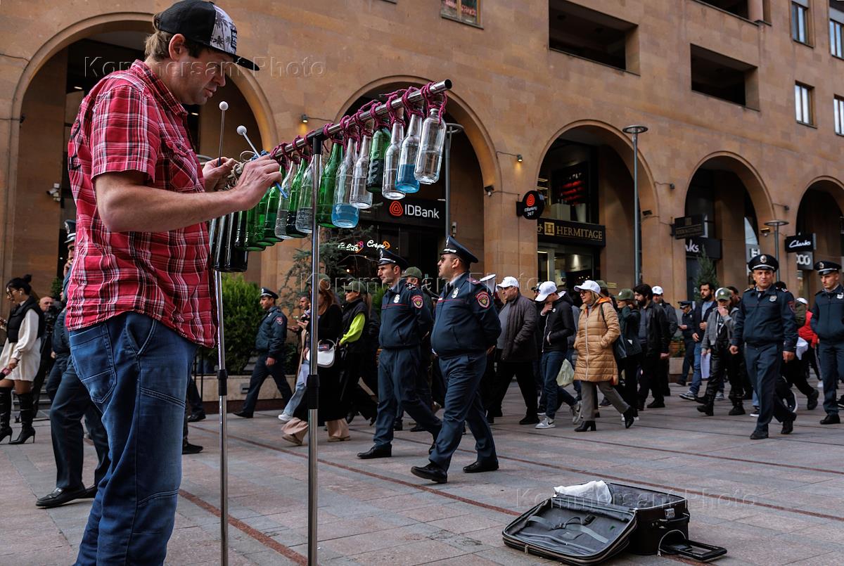 Митинг сторонников оппозиционного движения у здания Конституционного суда Армении. Жанровая фотография. Уличный музыкант играет на бутылках с водой.