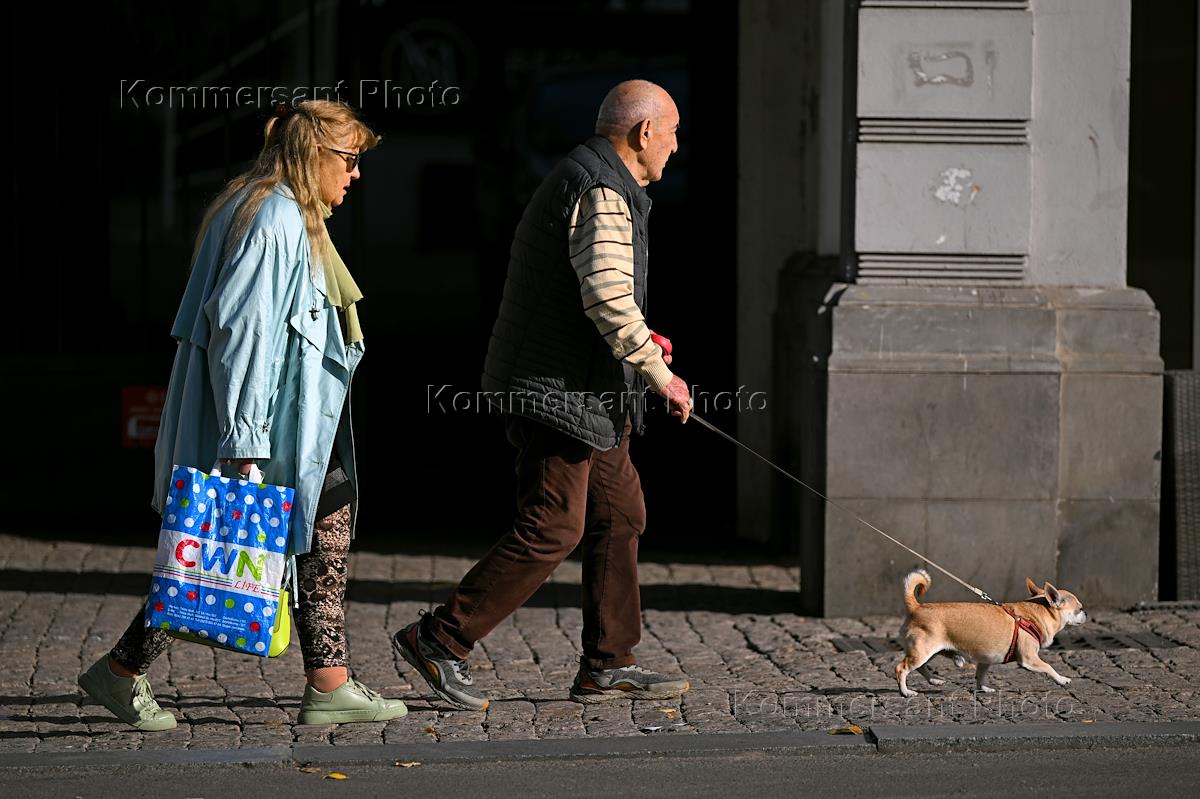 Виды Тбилиси. Жанровая фотография. Пожилые люди с собачкой идут по улице города.