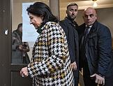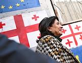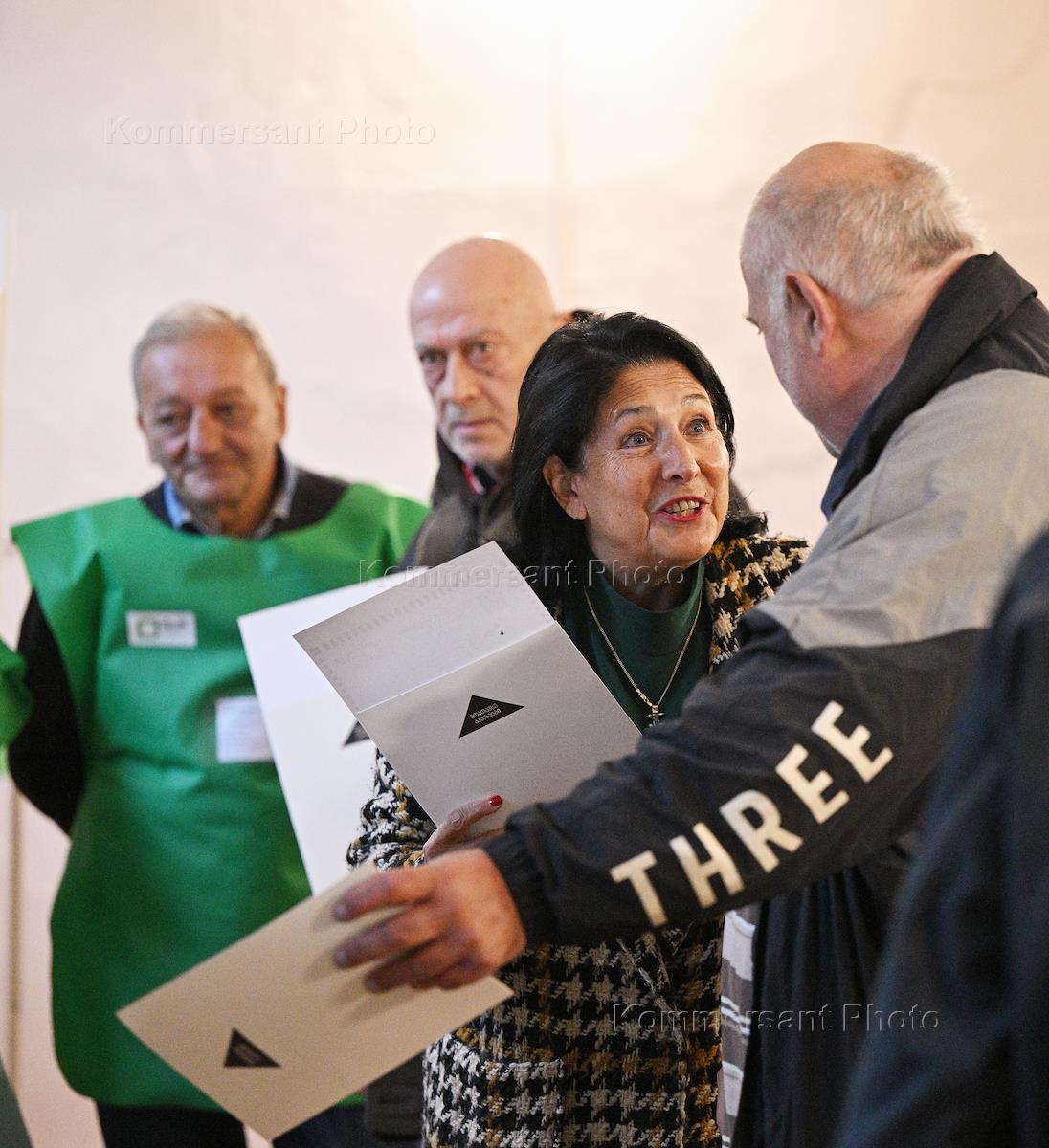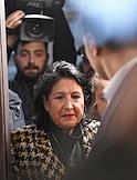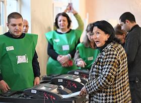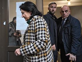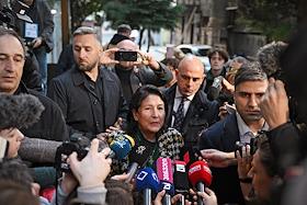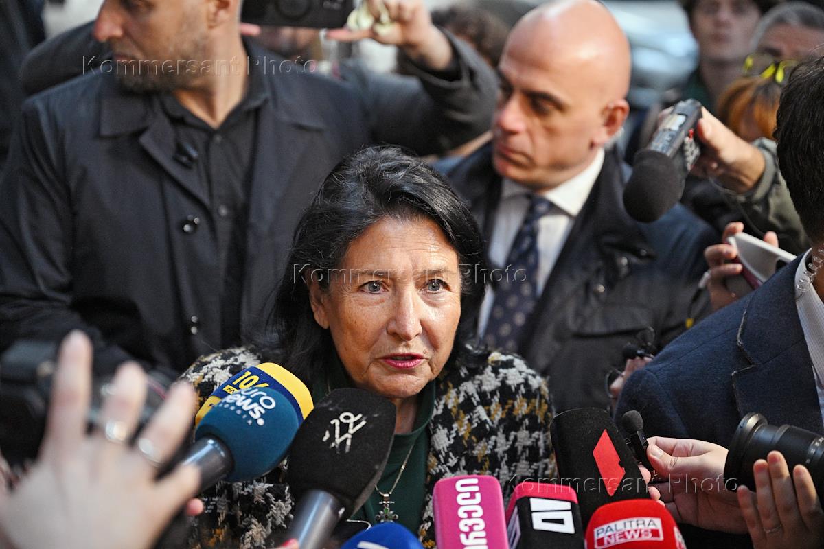 Парламентские выборы в Грузии. Президент Грузии Саломе Зурабишвили (в центре) во время общения с журналистами после голосования.