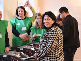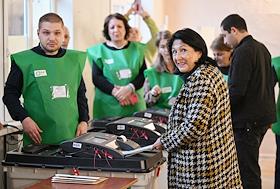 Парламентские выборы в Грузии. Президент Грузии Саломе Зурабишвили (справа) во время голосования на избирательном участке в школе №67.