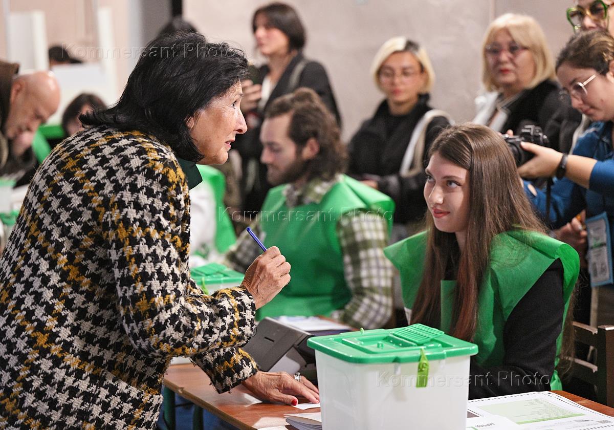 Парламентские выборы в Грузии. Президент Грузии Саломе Зурабишвили (слева) во время голосования на избирательном участке в школе №67.