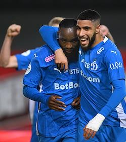 Мир Российская Премьер-Лига (РПЛ) 2024/2025. 13-й тур. Матч между командами "Химки" (Химки) - "Динамо" (Москва) на стадионе "Арена Химки". Игроки команды "Динамо" Муми Нгамалё (слева) и Эль-Мехди Маухуб (справа) во время матча.
