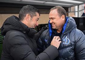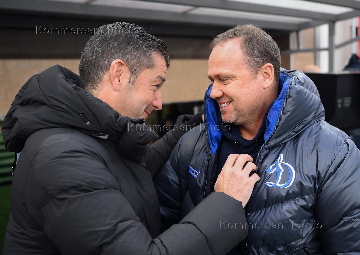 Мир Российская Премьер-Лига (РПЛ) 2024/2025. 13-й тур. Матч между командами "Химки" (Химки) - "Динамо" (Москва) на стадионе "Арена Химки". Главный тренер команды "Химки" Франк Себриан Артига (слева) и главный тренер команды "Динамо" Марцел Личка во время матча.