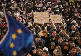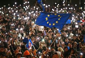 Ситуация в Тбилиси после парламентских выборов в Грузии. Акция протеста оппозиции против результатов выборов у здания Парламента Грузии. Парламентские выборы прошли в Грузии 26 октября. По данным ЦИК, правящая "Грузинская мечта" набрала 53,93% голосов. В парламент также прошли четыре оппозиционные партии, получив в сумме 37,78%. Представители оппозиции уже заявили, что не признают данные ЦИК.