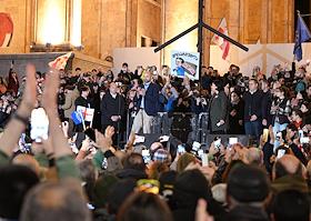 Ситуация в Тбилиси после парламентских выборов в Грузии. Акция протеста оппозиции против результатов выборов у здания Парламента Грузии. Парламентские выборы прошли в Грузии 26 октября. По данным ЦИК, правящая "Грузинская мечта" набрала 53,93% голосов. В парламент также прошли четыре оппозиционные партии, получив в сумме 37,78%. Представители оппозиции уже заявили, что не признают данные ЦИК. Один из лидеров оппозиционной партии "Единое национальное движение" Георгий Вашадзе (в центре) во время акции.