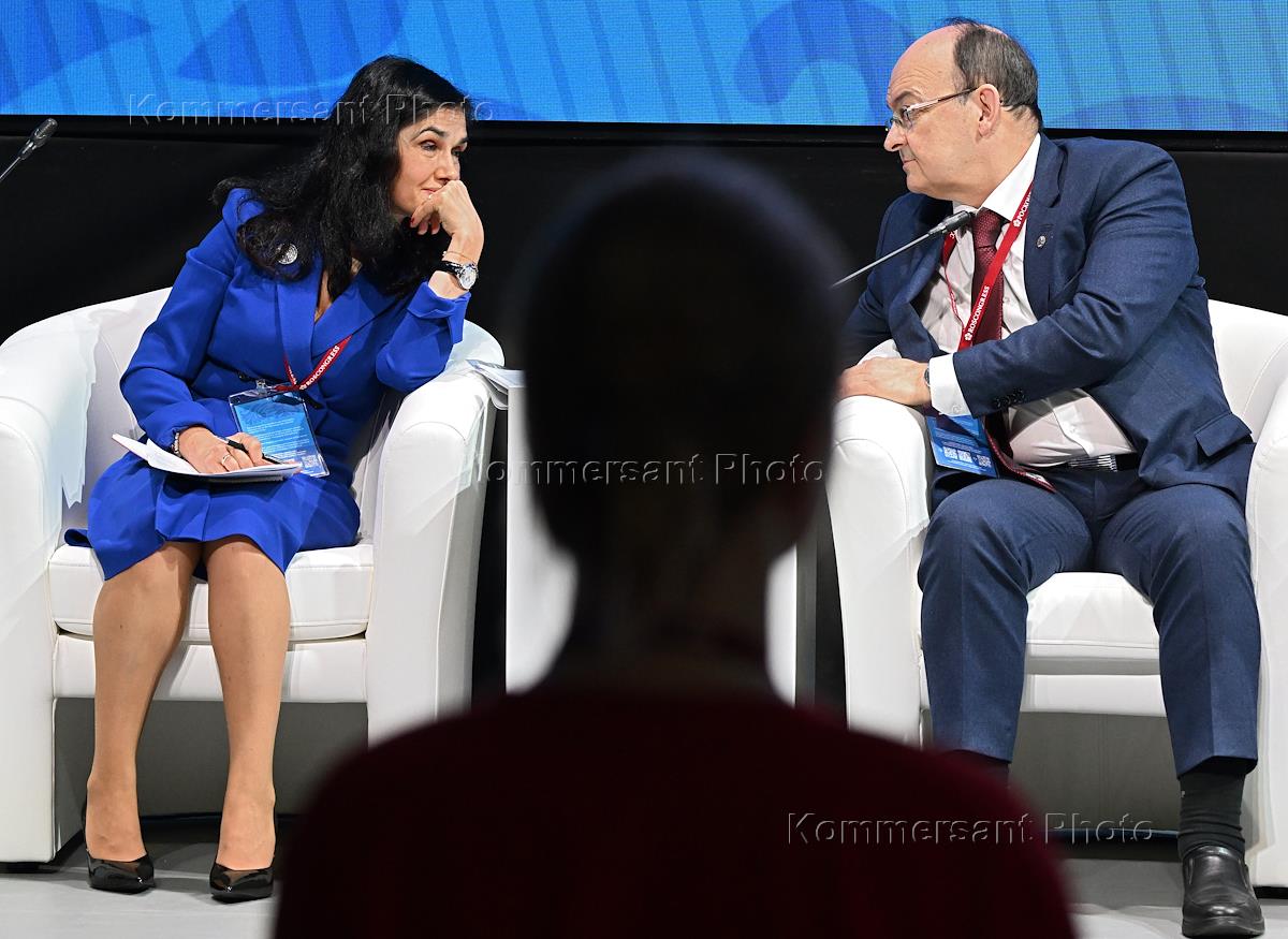 3rd National Congress "National Health Care" in the Moscow Innovation Cluster "Lomonosov". Session "Health protection as the basis for preserving human capital asset". Vice-President of the Russian Academy of Sciences Mikhail Piradov (right) and Chief Officer of the National Medical Research Center for Therapy and Preventive Medicine of the Russian Ministry of Health, chief external specialist in therapy and general medical practice of the Russian Ministry of Health Oksana Drapkina (left) during the session.