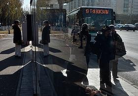 Виды Астаны. Жанровая фотография. Люди на остановке общественного транспорта.